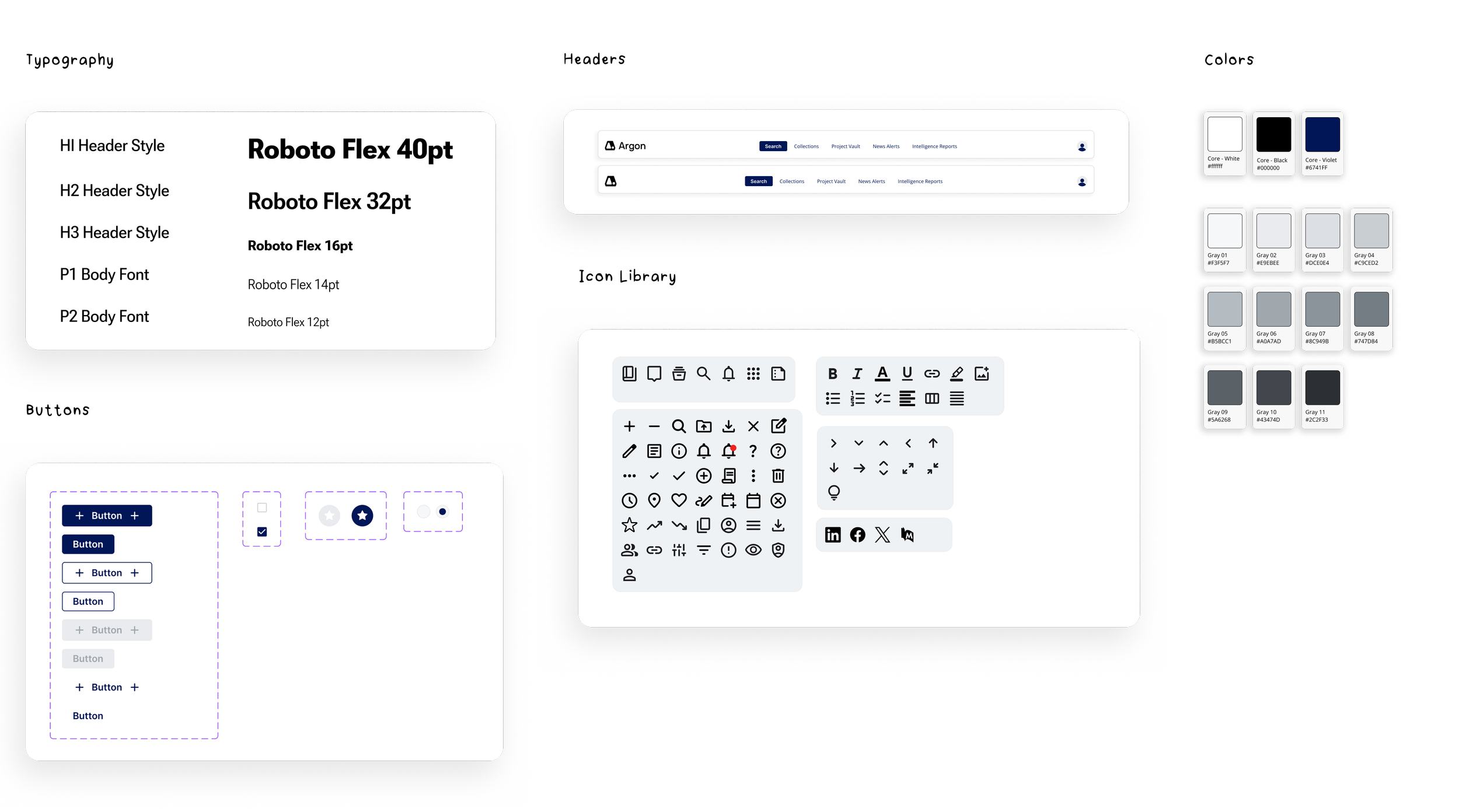 The system included color, typography, iconography, components, and layout foundations — all tailored to the needs of a dense, data-driven interface. I also worked closely with developers to ensure I was aligning my decisions with Material UI (the framework they were using). This informed several of my design decisions and led to adjustments during handoff.