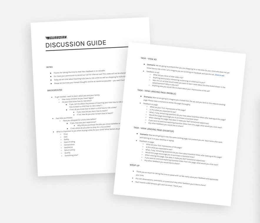 In order to understand the issues users are having with the landing page, we needed to talk to them directly. We conducted a total of 16 user interviews/usability tests in order to gather in-depth qualitative insights. We asked users about their experience teaching their child to ride a bike and of any previous bike buying experiences. We also asked them to look over the current landing page on both desktop and mobile.